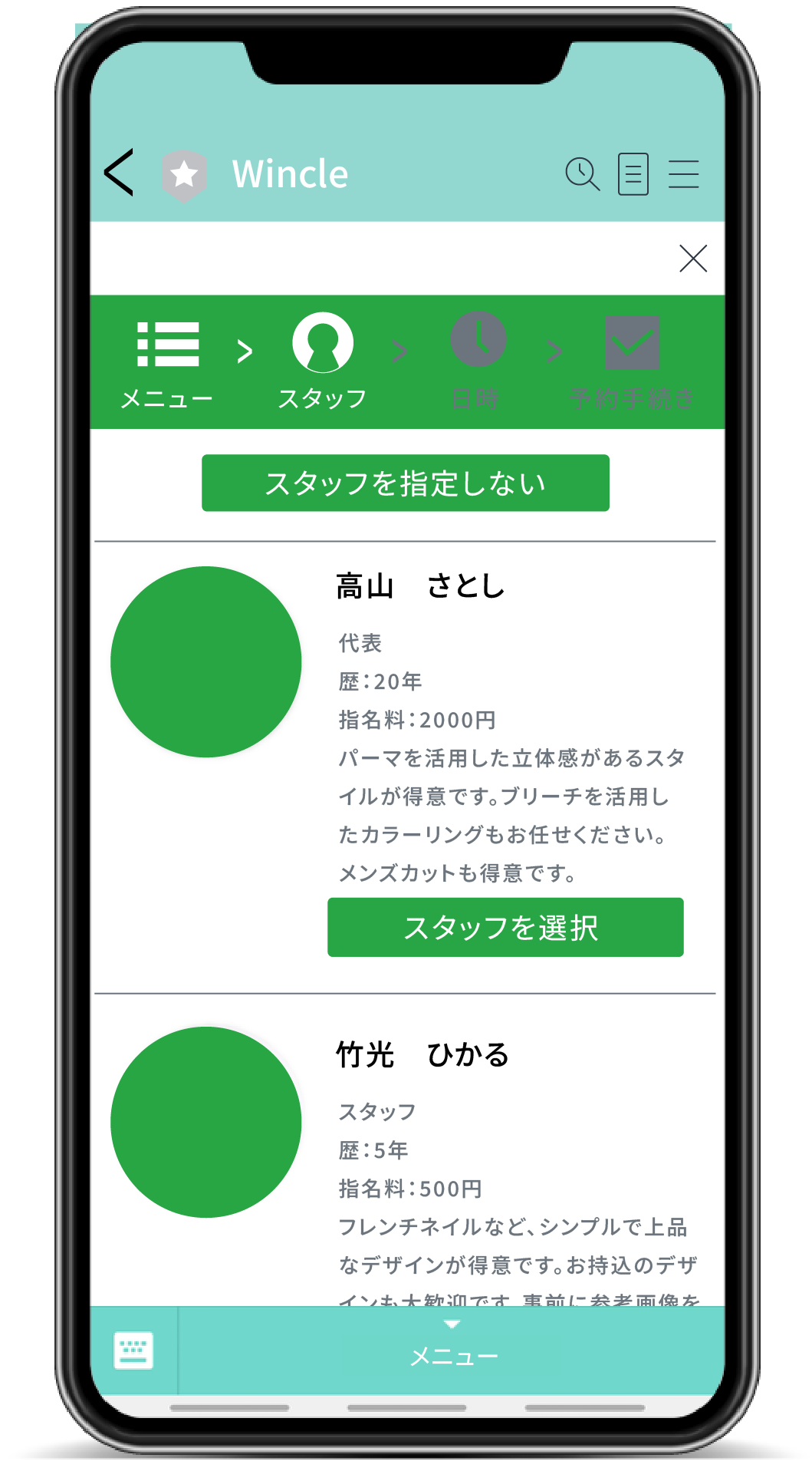 スタッフ指名はもちろん、メニュー毎に担当できるスタッフを指定することもできます。LINE問い合わせもスタッフ別に分けて管理することができます。